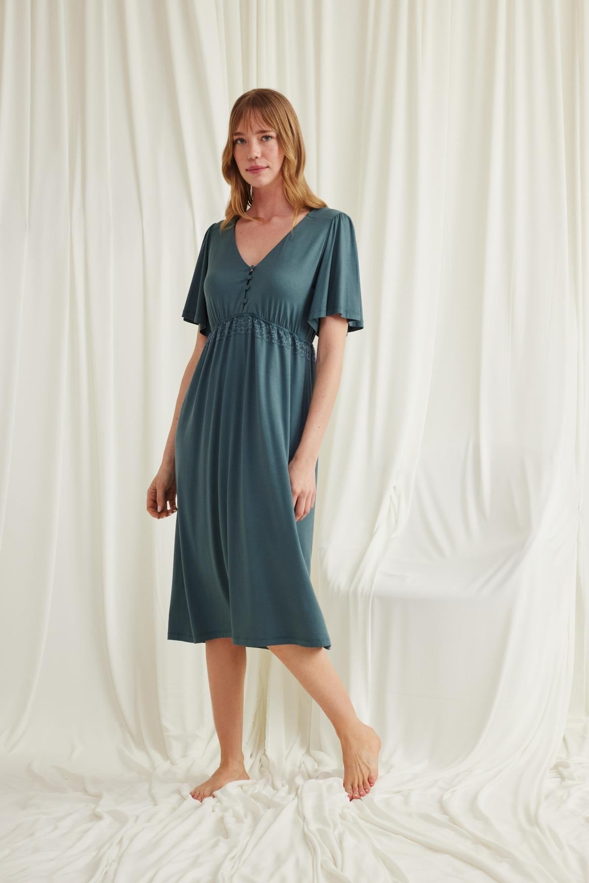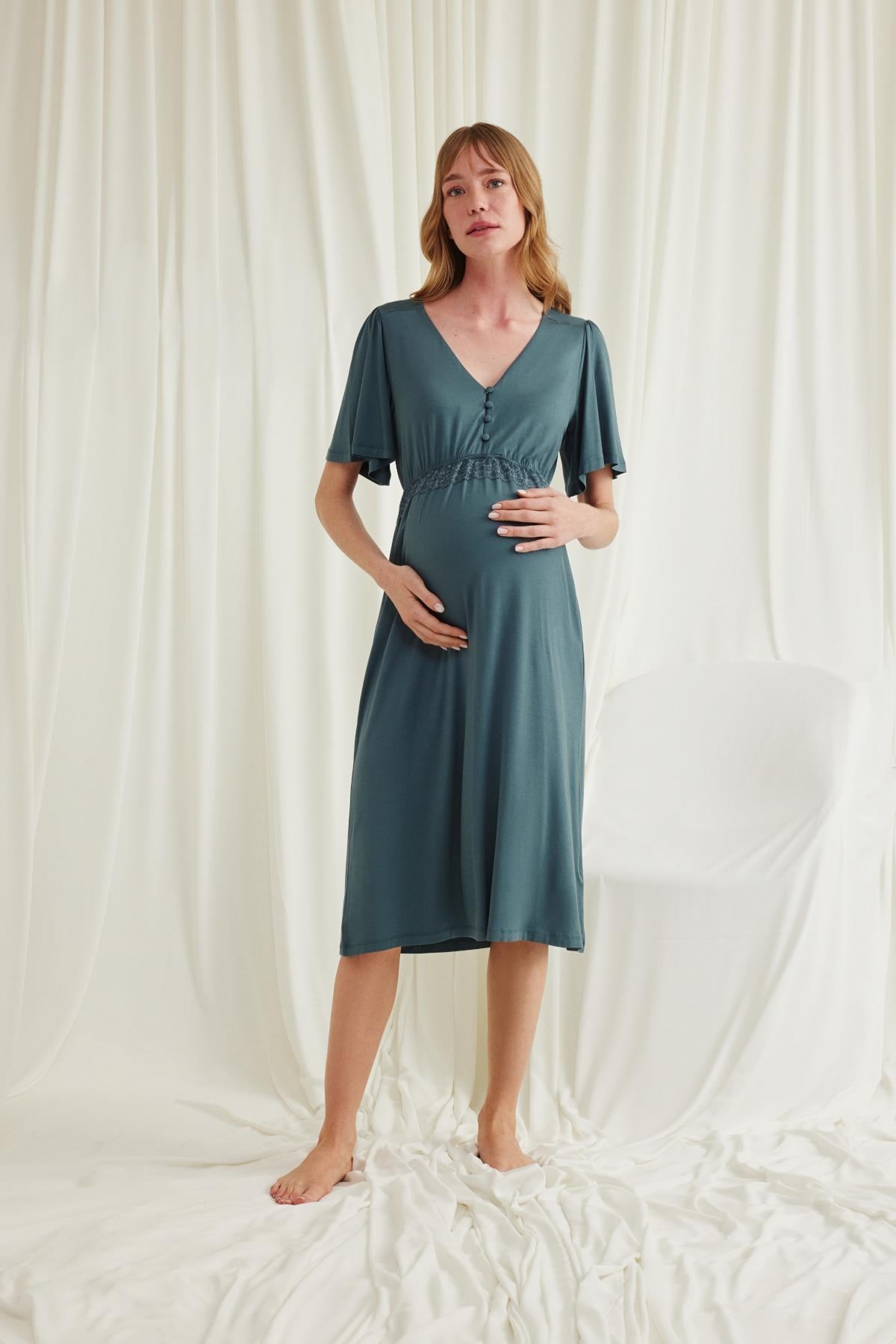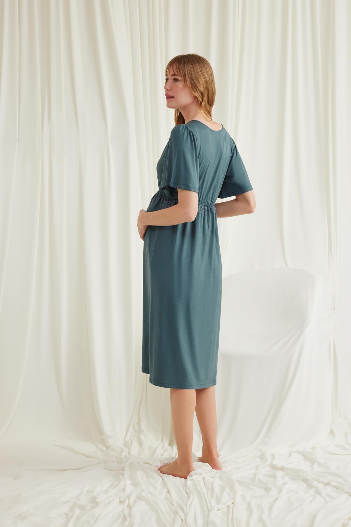 Gecelik: Yeşil renklidir, V yakalıdır, kolu ve beli dantellidir, yakasının altı düğmelidir, emzirme için düğmelerden açılır durumdadır, kısa kolludur, örme kumaştır. Materyal %94 Viskon %6 Elastan