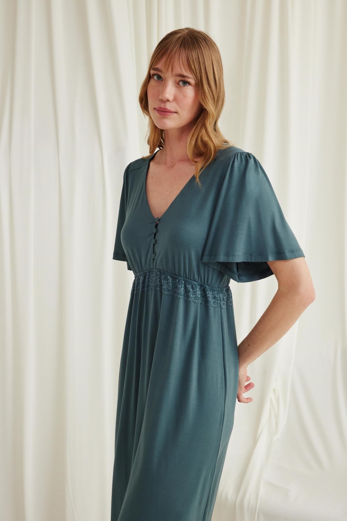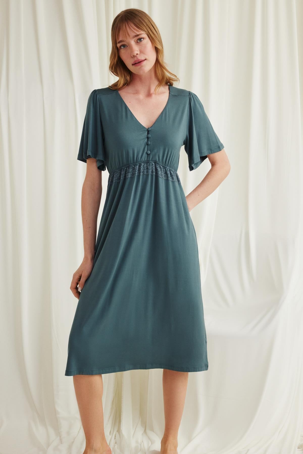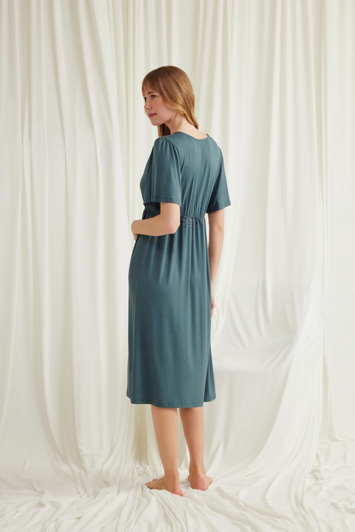 Gecelik: Yeşil renklidir, V yakalıdır, kolu ve beli dantellidir, yakasının altı düğmelidir, emzirme için düğmelerden açılır durumdadır, kısa kolludur, örme kumaştır. Materyal %94 Viskon %6 Elastan