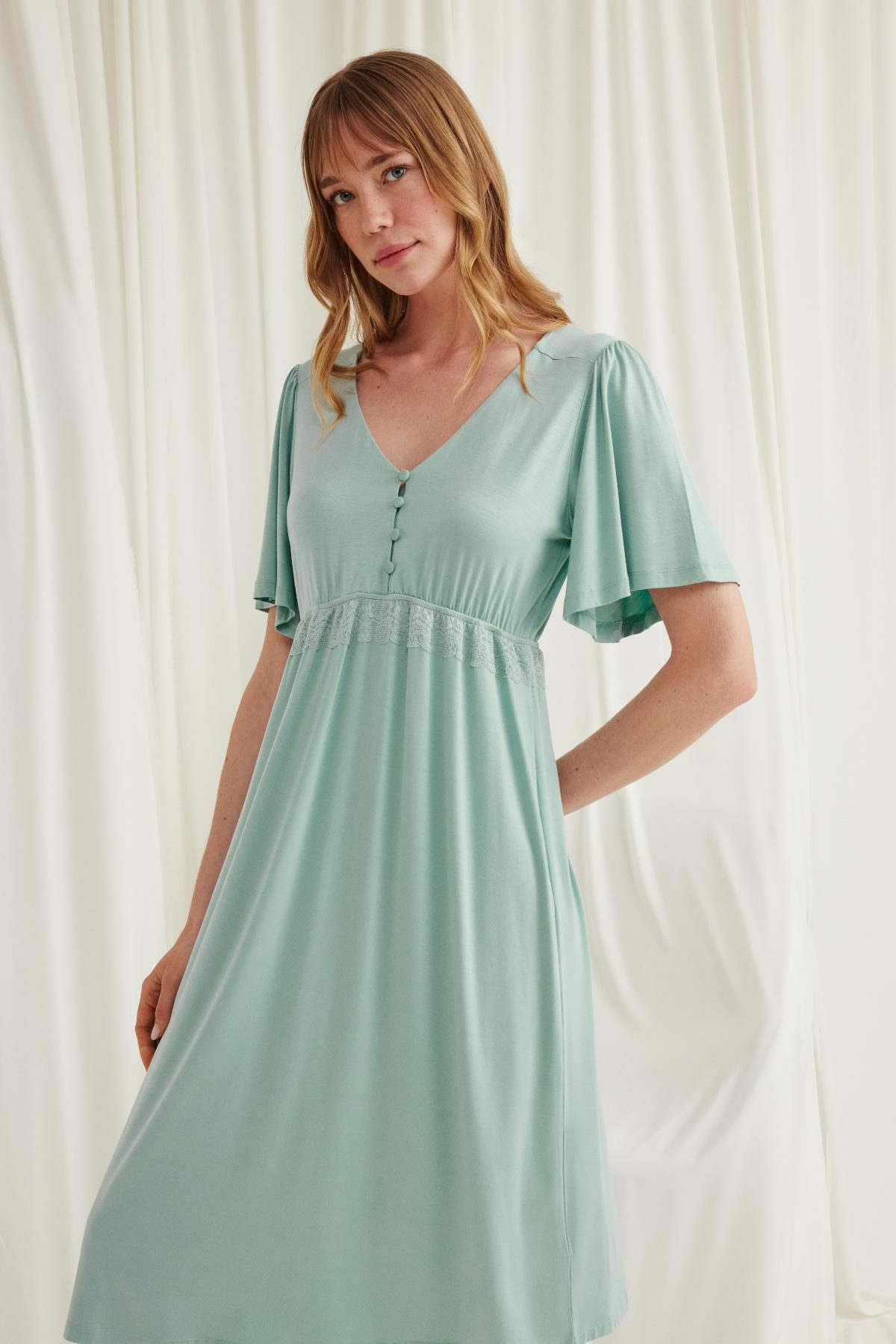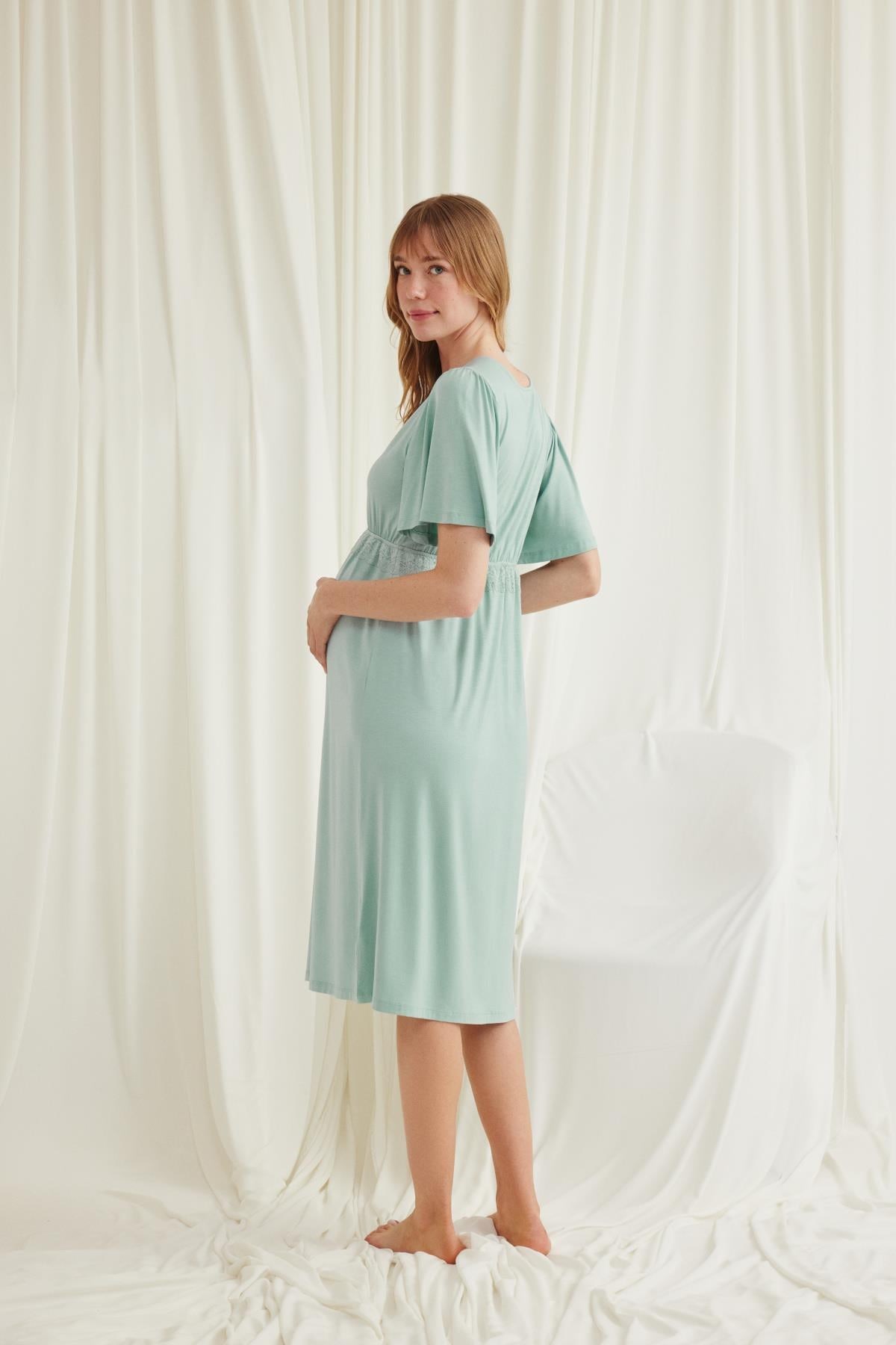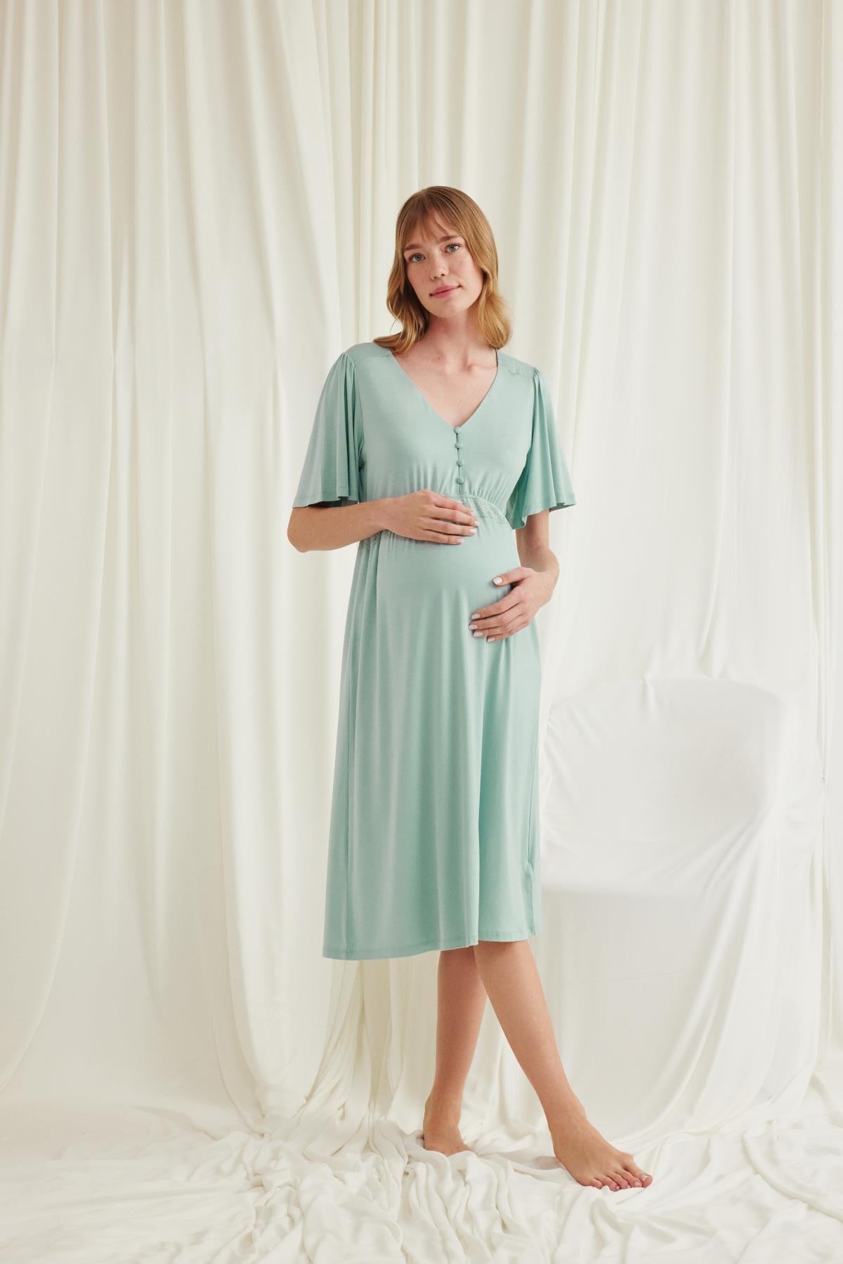 Gecelik: Açık Yeşil renklidir, V yakalıdır, kolu ve beli dantellidir, yakasının altı düğmelidir, emzirme için düğmelerden açılır durumdadır, kısa kolludur, örme kumaştır. Materyal %94 Viskon %6 Elastan
